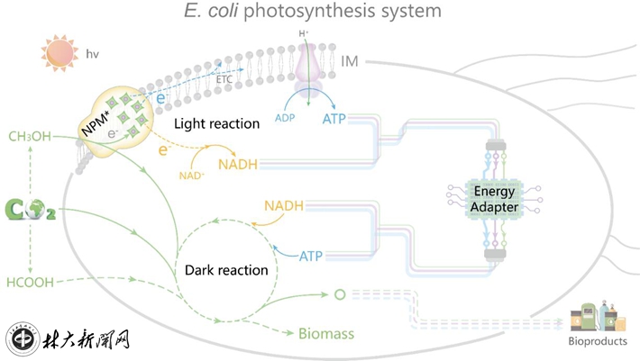 ▲大肠杆菌中全新光合系统利用一碳底物负碳、智能合成化学品示意图